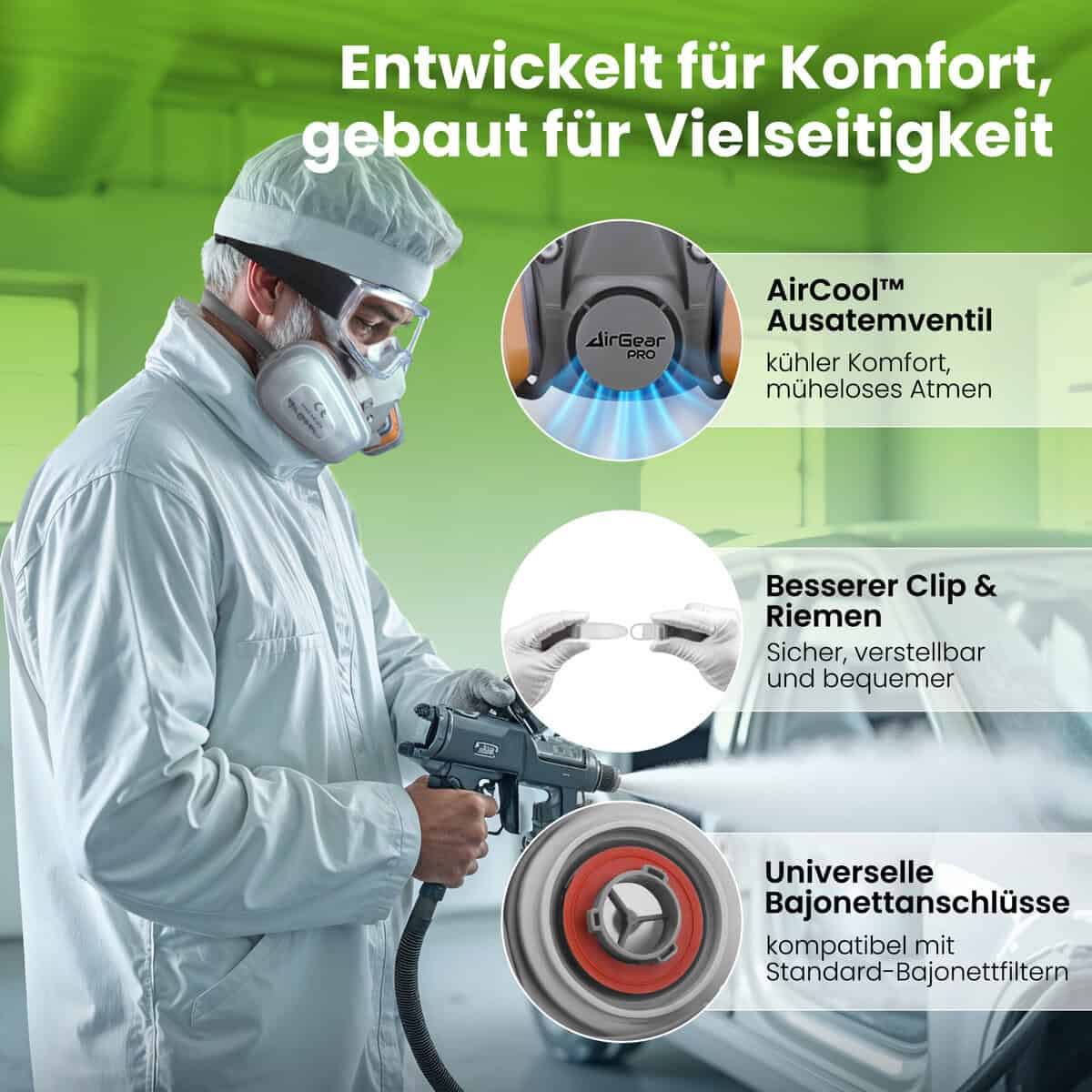 LEICHT & KOMFORTABEL: Die AirGearPro G-500 Atemschutzmaske ist leicht und angenehm zu tragen, was sie zur perfekten Wahl für lange Arbeitseinheiten macht. Die verstellbaren Riemen und hochwertigen Materialien gewährleisten einen engen, bequemen Sitz, der keine Ermüdung oder Reizung verursacht, sodass Sie sich auf die anstehende Aufgabe konzentrieren können.