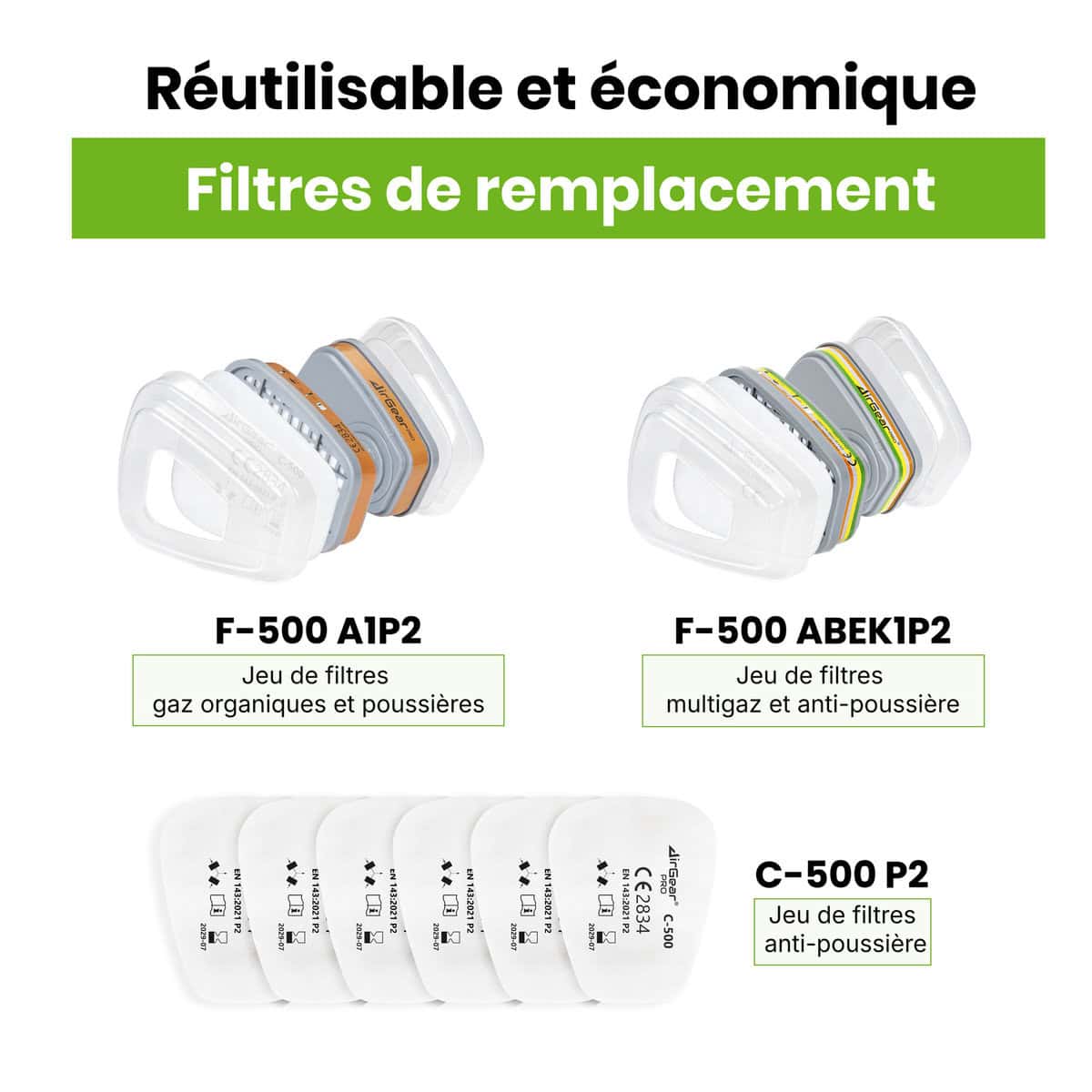 COMPATIBLE : Outre sa compatibilité avec les masques et respirateurs réutilisables G-500, M-500 et G-750 de la marque AirGearPro, le kit de filtre F-500 ABEK1 -P2 est conçu pour s’intégrer de manière transparente à d’autres masques anti-poussière respiratoires dotés d’une connexion de filtre à baïonnette.