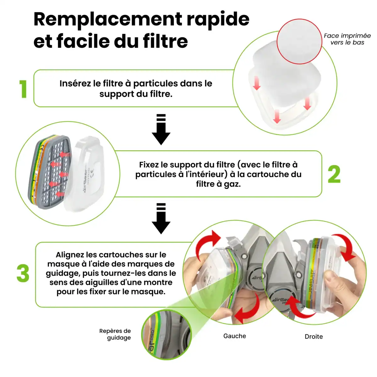 MASQUE RÉUTILISABLE : économisez de l’argent et préservez la planète en même temps. La conception de notre masque à filtre interchangeable vous permet de remplacer les cartouches lorsqu’elles arrivent en fin de vie et de continuer à utiliser le masque avec une filtration optimale.