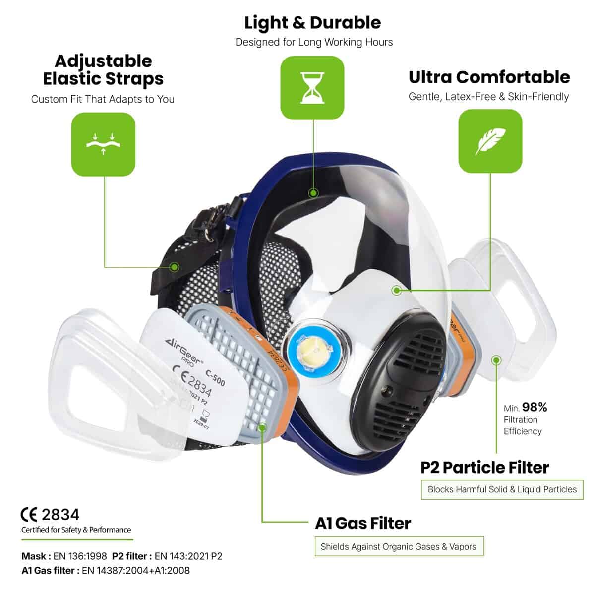 CE CERTIFIED: The AirGearPro M-500 ABEK1-P2 Respirator Mask is rigorously tested and certified to meet the highest standards of quality and safety. This ensures reliable protection against a variety of hazards, including spray painting, sanding,building work, renovation, demolition, construction, DIY, industrial, chemical, military use, and more.