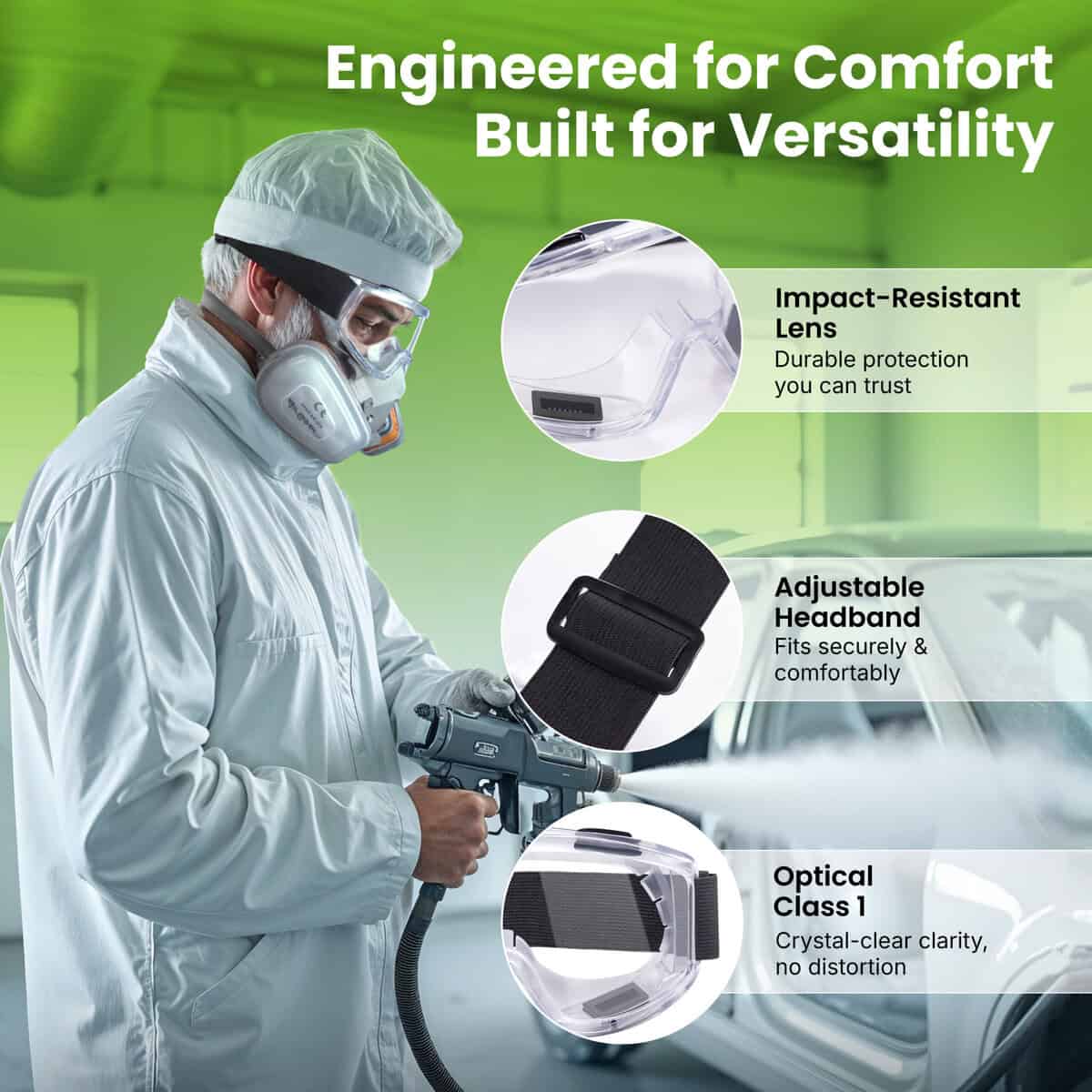CE CERTIFIED: AirGearPro Vision-1000 eye protection glasses are CE certified (EN166:2001) to ensure your safety during painting, renovation, demolition, sanding, DIY, construction, chemistry, etc.